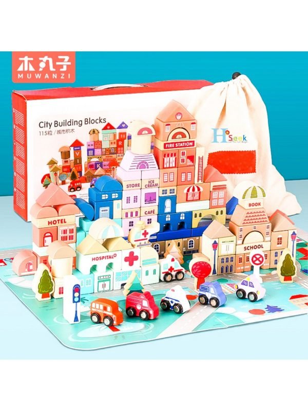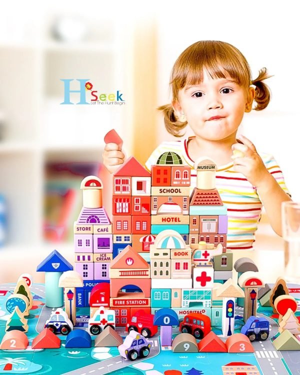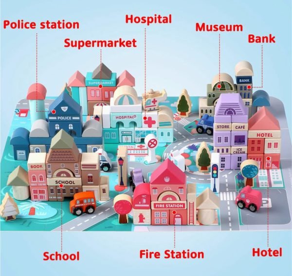 These wooden stacking blocks set come with a city playmat, suitable for toddlers playing at home or outdoors.