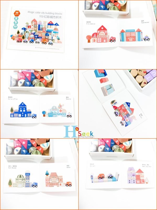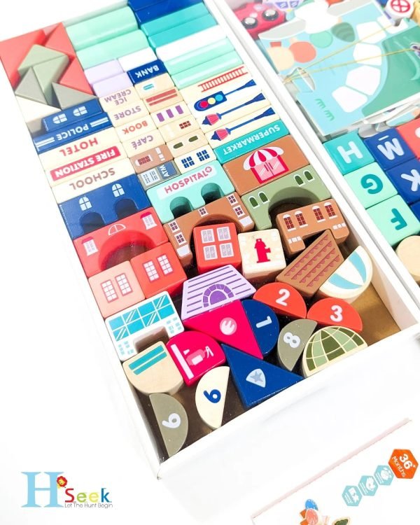 Blocks contain numbers and words. Encourage children to know about various city buildings and transportation.