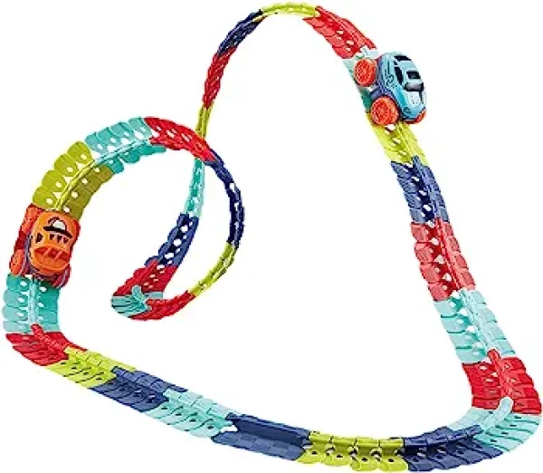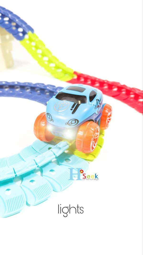 Rail Car Toys features 230 interchangeable rainbow racing tracks, allowing kids to build custom tracks in seconds! This quick and easy track setting for kids also includes 1 LED racing toy (requires 3 AA batteries – not included)2 interchangeable different car casings, 4 color tracks.