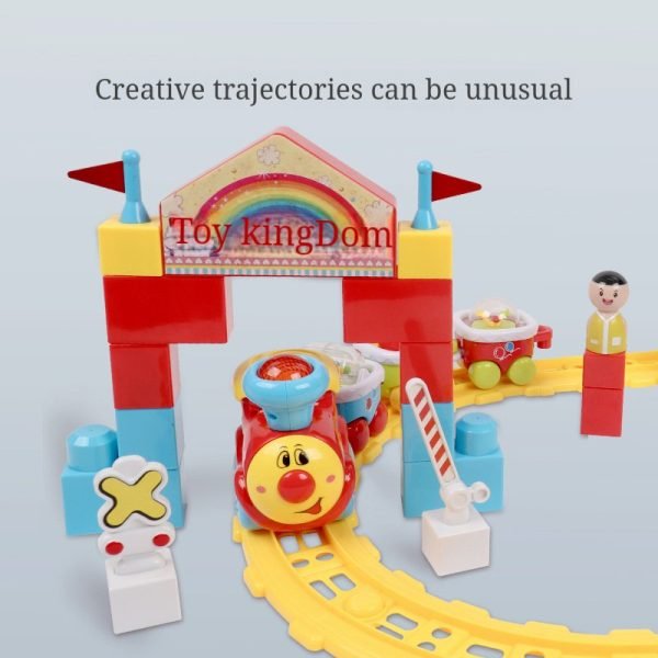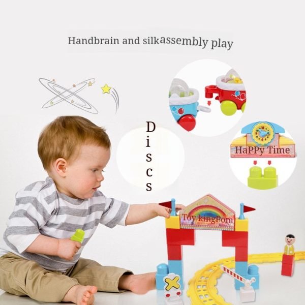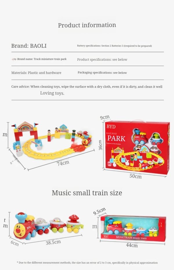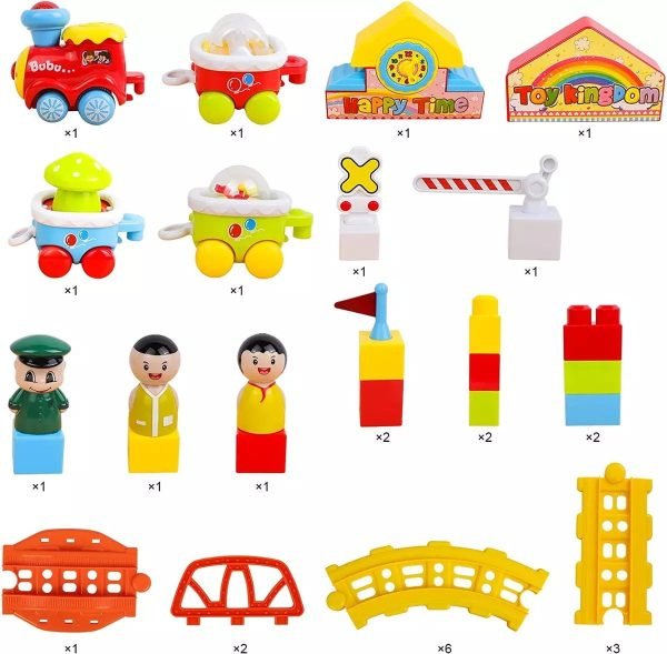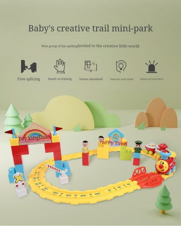 Dream Party Railroad Park – Product includes: 4 colorful toddler trains with music and lights, 3 toddler toys, 2 road signs, 12 tracks, 16 building blocks, kids can use their imagination to put together your own train park. (Note: Requires 3 AA batteries, not included.