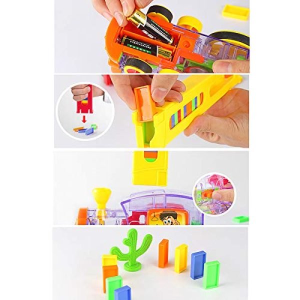 e 2″ AA “Size Batteries (not included)- EMULATION DOMINO TRAIN TOYS: Really simulate the train operation, operating with sound and music, automatic laying dominoes. Set them up all in a row, and then push one and watch the chain effect of the dominoes tumbling over like a race.