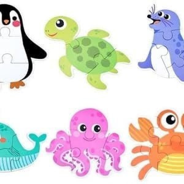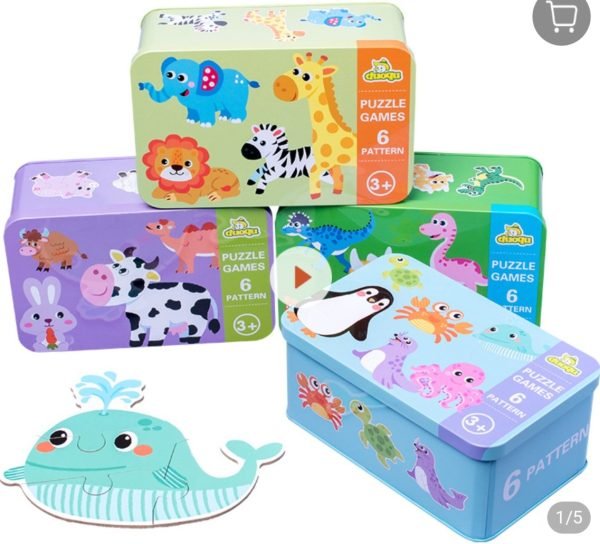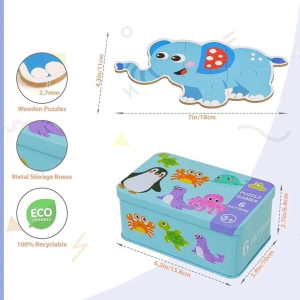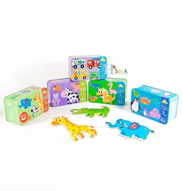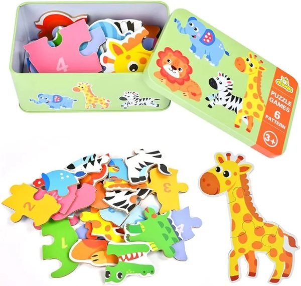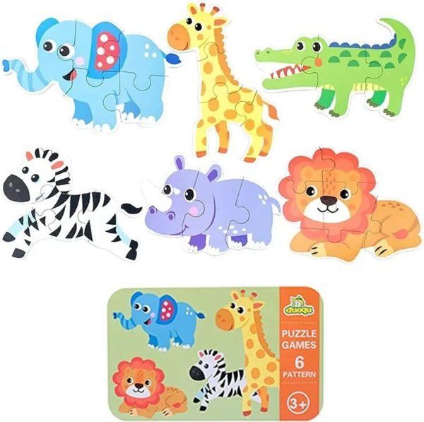 - The puzzle is made of solid wood with an attractive design showing six different wild animals, such as elephant, giraffe, zebra, rhino, lion and crocodile. Each piece of the puzzle has a unique shape, which makes it more interesting for children to complete it. In addition, the non-toxic paint used in the coating of the puzzle makes it safe for children.