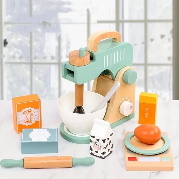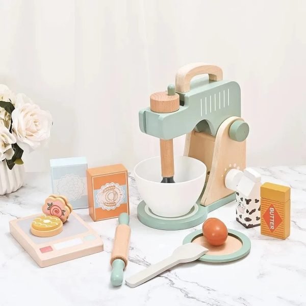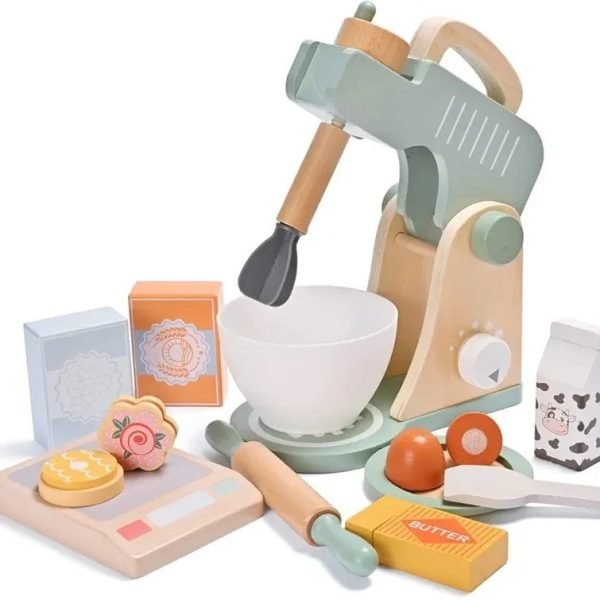 【Wooden Play Kitchen Accessories】This wooden mixer toy kitchen set contains a premium wooden mixer with an exclusively designed baking set, which includes 1 classic mixer, 1 scale,egg and flour, sugar, milk, butter, 1 rolling pin, 2 cookies, bowl, small plate, shovel.