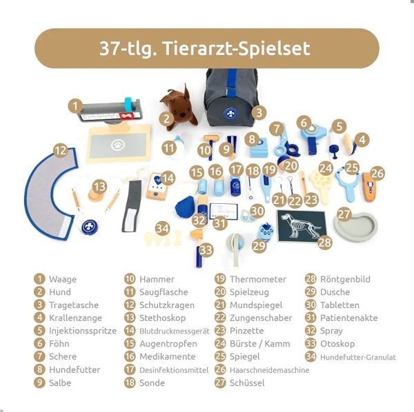Veterinarian Wooden Play Set for Children with Plush Dog, Stethoscope, Blood Pressure Monitor and Much More, Veterinary Toy for Role Play, 37 Piece Set for 3, 4, 5 Years Old Girls and Boys